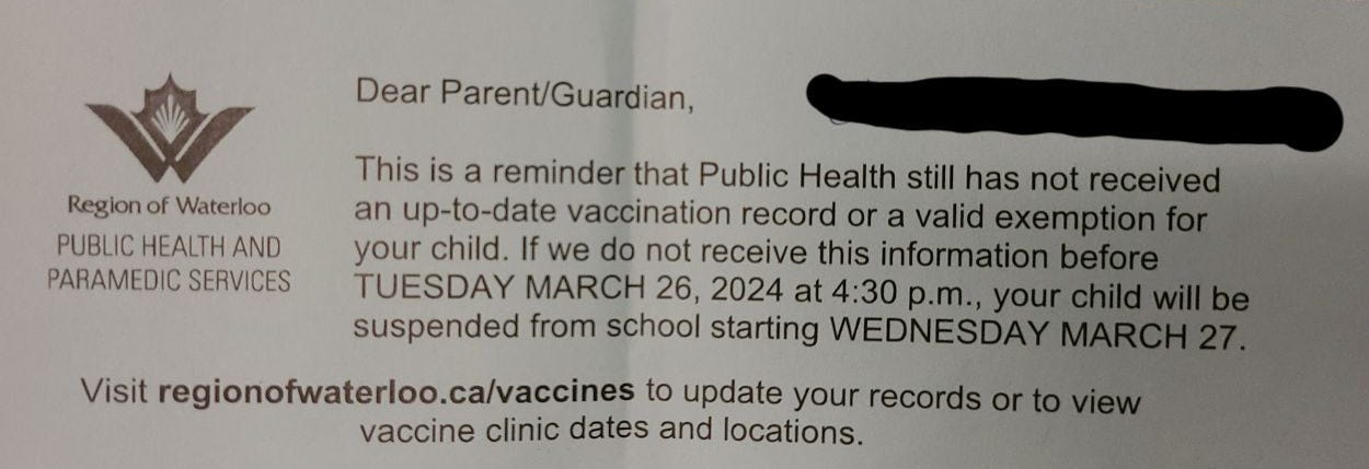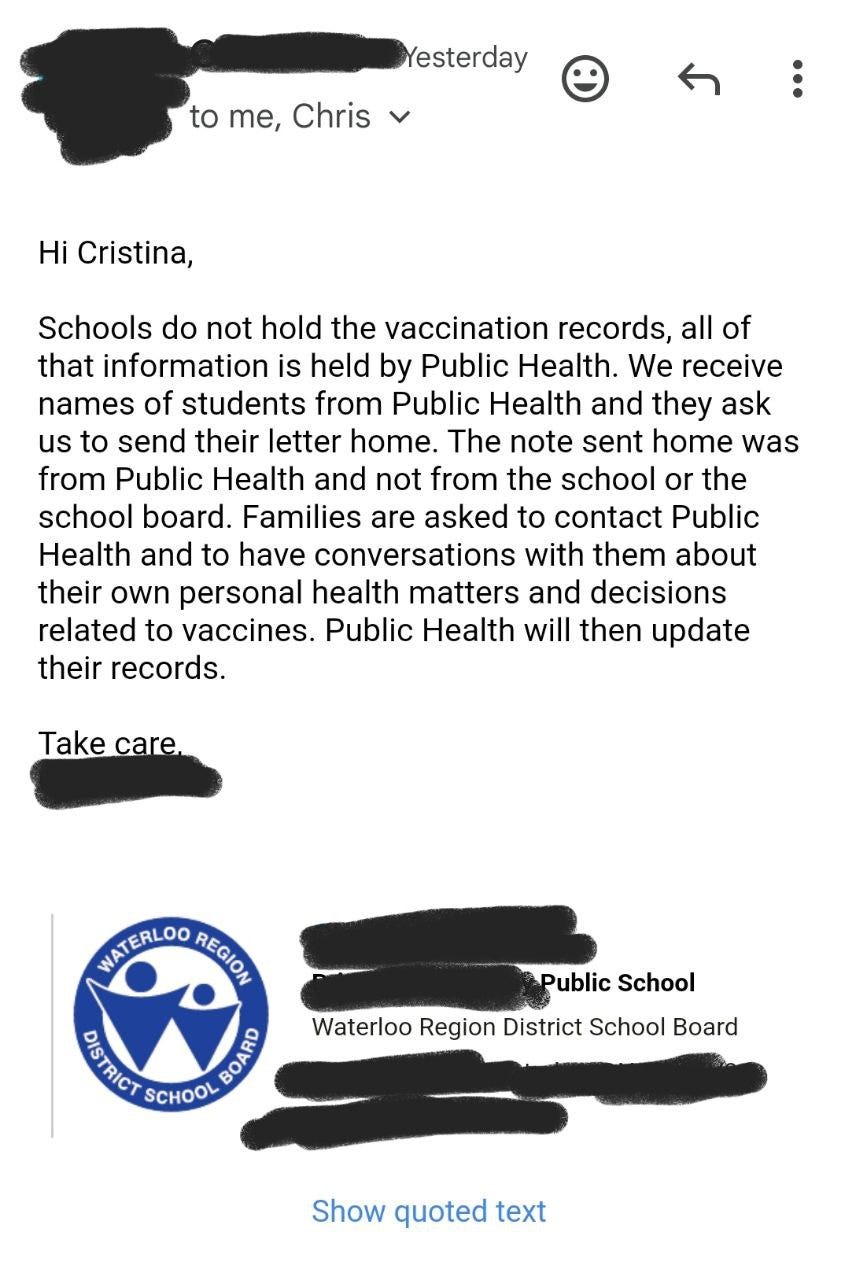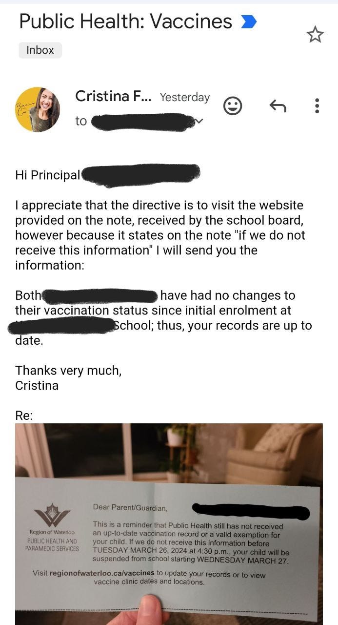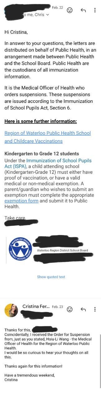 Following this correspondence, I received the official notice from the Region of Waterloo Public Health and Paramedic Services: