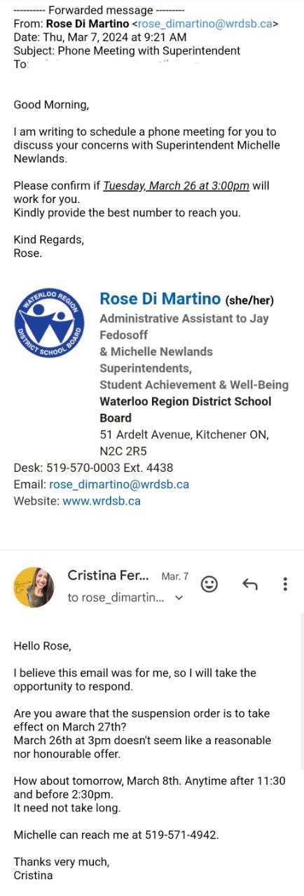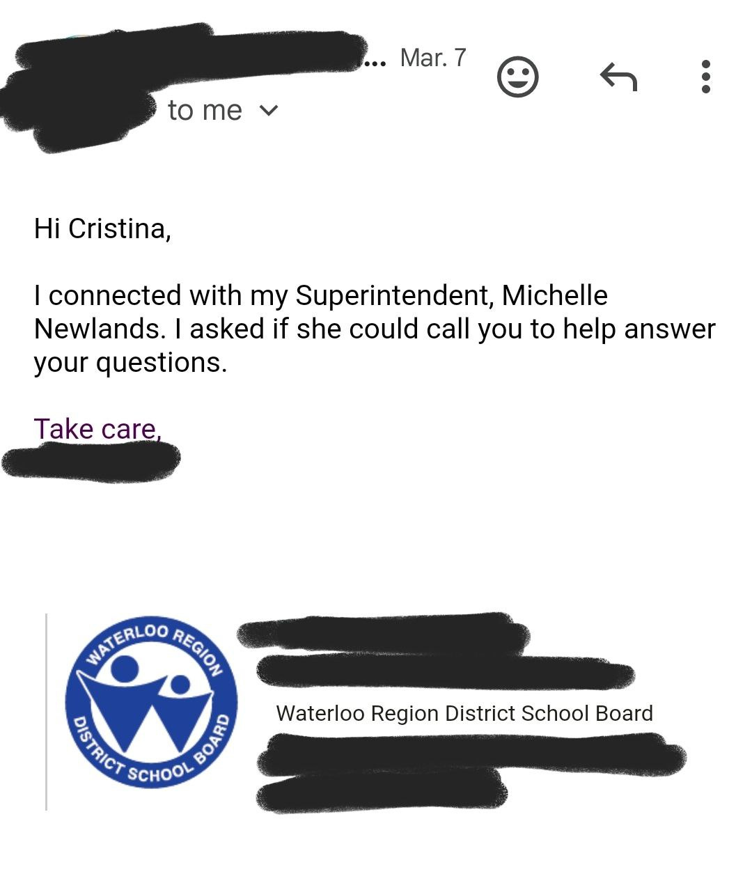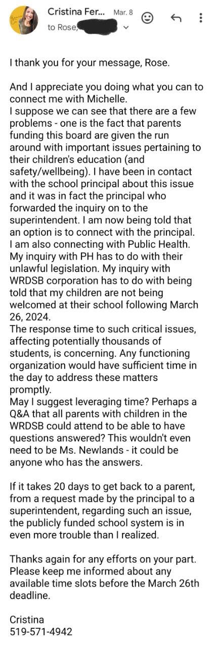 On March 5, 2024 I had yet to hear back from my sons’ principal from my last correspondence on Feb 23, 2024, so sent them the following: