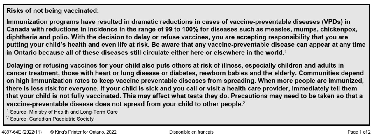 While I'm happy to see that you are seeking a direct and honourable confrontation in this matter, I'd like to clarify something about the "Risks of not being vaccinated" section. I got exemptions for my kids and my understanding is that this section is purely for show. The actual affidavit that you would swear to doesn't mention it, or any requirement to acknowledge what it's saying as true or valid (which is obviously isn't).