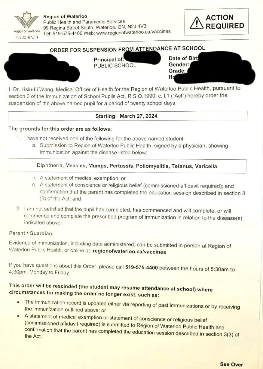 If on March 27th, staff from your child(ren)’s school states that your child(ren) are suspended. Perhaps consider getting it in writing from the staff/principal that is issuing the suspension. The WRDSB and PH have still not answered the questions on whether or not this would be a legal act.