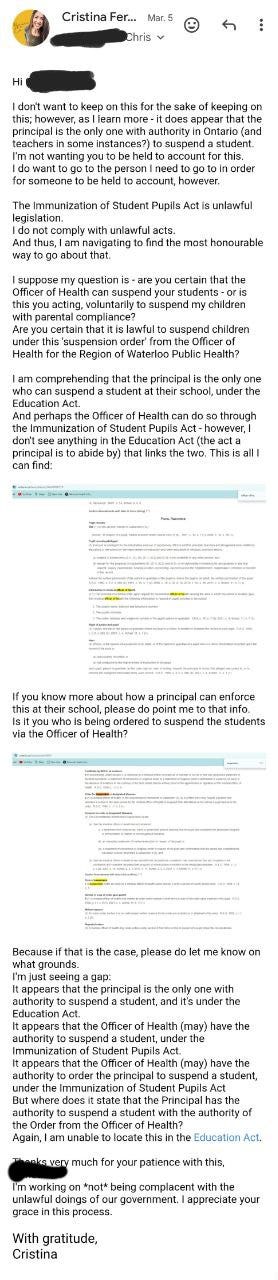 Now, I'm not a lawyer, but I found myself puzzled by the repeated assertion that 'the principal is the only one authorized to suspend a student at their school'—a fact I know to be true according to the Education Act. However, the suspension orders weren't originating from the principal; they were issued by the Officer of Public Health for the Region of Waterloo. One would expect the Education Act to provide clear guidance for principals regarding their duty to enforce such orders, but alas, it does not.