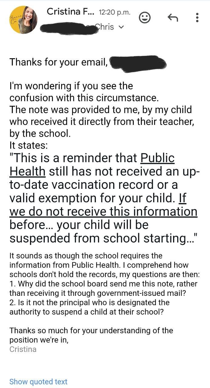 This is such a confusing time for parents specifically as schools threaten to suspend their children because of their vaccination status. Finding information and assistance can be difficult. To navigate exemptions, the process and additional information, I invite parents and concerned individuals to visit the Vaccine Choice national website: https://vaccinechoicecanada.com/news-bulletin/